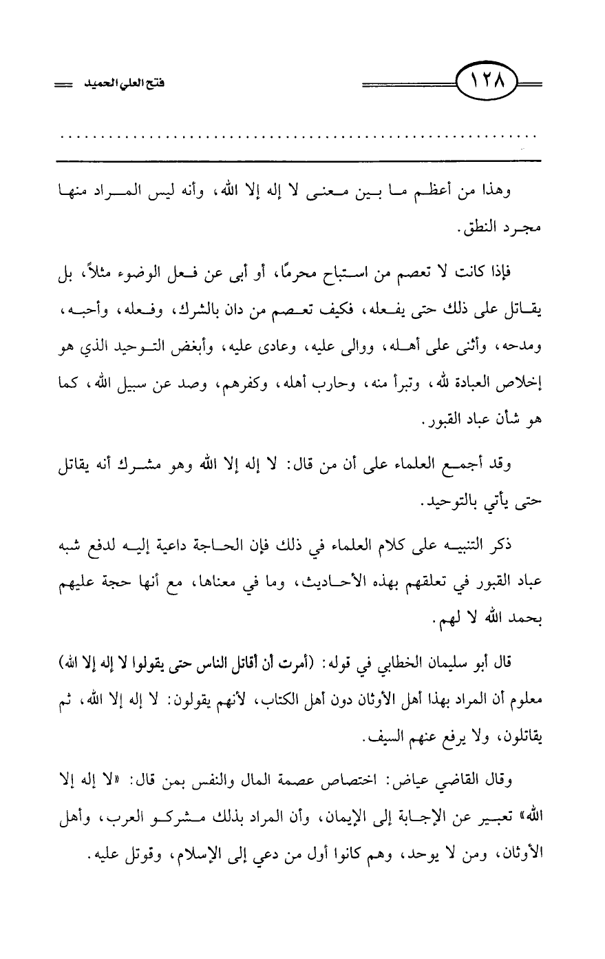 فإذا كانت لا تعصم من استباح محرمًا، أو أبى عن فعل الوضوء مثلاً، بل يقاتل على ذلك حتى يفعله، فكيف تعصم من دان بالشرك، وفعله، وأحبه، ومدحه، وأثنى على أهله، ووالى عليه، وعادى عليه، وأبغض التوحيد الذي هو إخلاص العبادة لله، وتبرأ منه وحارب أهله، وكفرهم، وصد عن سبيل الله، كما هو شأن عبَّاد القبور.