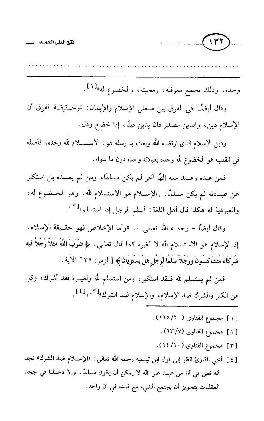 وقال أيضًا: رحمه الله تعالى - «وأما الإخلاص فهو حقيقة الإسلام، إذ الإسلام هو الاستسلام لله لا لغيره كما قال تعالى: {ضَرَبَ اللَّهُ مَثَلاً رَجُلاً فِيهِ شُرَكَاءُ مُتَشَاكِسُونَ وَرَجُلاً سَلَمًا لِرَجُلٍ هَلْ يَسْتَوِيَانِ} [الزمر: 29] الآية.