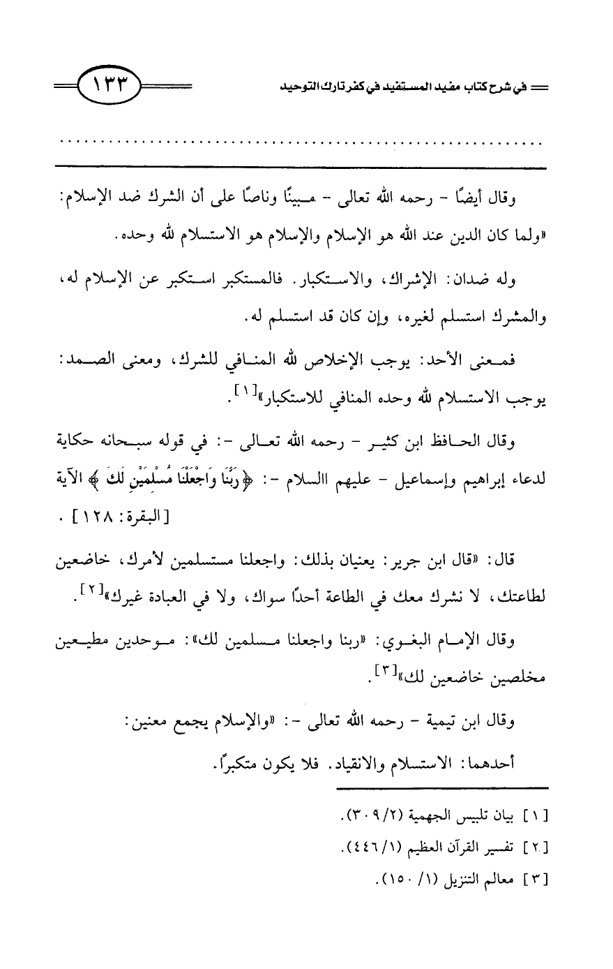وقال أيضًا - رحمه الله تعالى - مبينًا وناصًا على أن الشرك ضد الإسلام: «ولما كان الدين عند الله هو الإسلام والإسلام هو الاستسلام لله وحده.