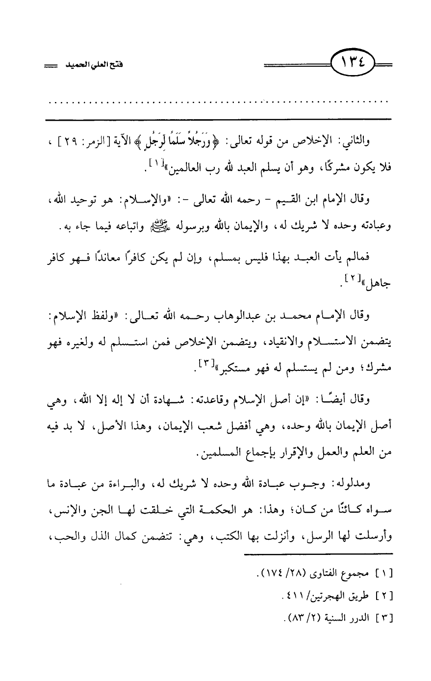 وقال الإمام محمد بن عبد الوهاب رحمه الله تعالى: «ولفظ الإسلام: يتضمن الاستسلام والانقياد، ويتضمن الإخلاص فمن استسلم له ولغيره فهو مشرك؛ ومن لم يستسلم له فهو مستكبر» (¬3).