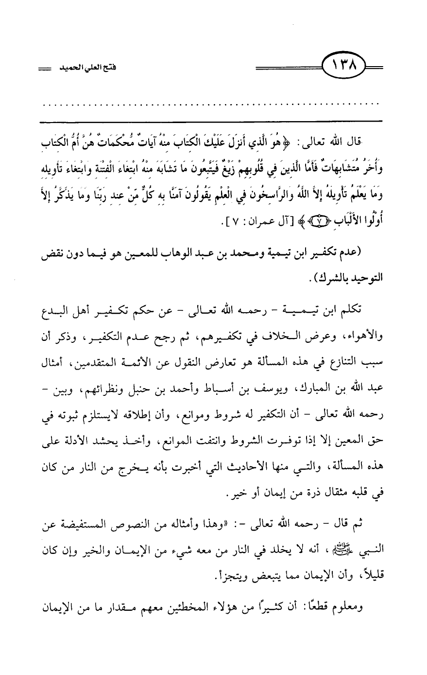 كتاب فتح العلي الحميد في شرح كتاب مفيد المستفيد في كفر تارك التوحيد