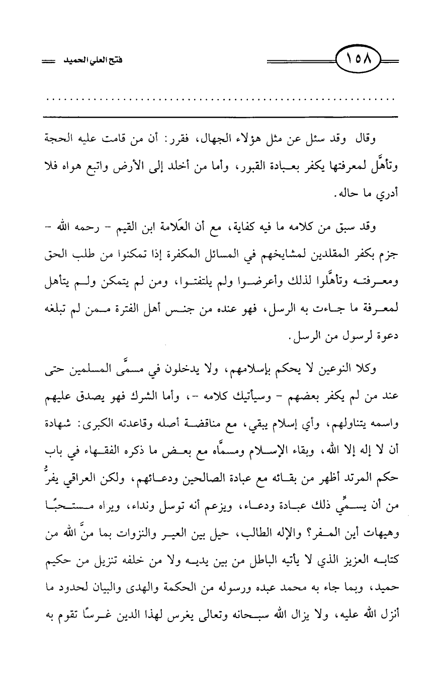 وقال وقد سئل عن مثل هؤلاء الجُهَّال، فقرر: أن من قامت عليه الحجة وتأهَّل لمعرفتها يكفر بعبادة القبور، وأما من أخلد إلى الأرض واتبع هواه فلا أدري ما حاله.