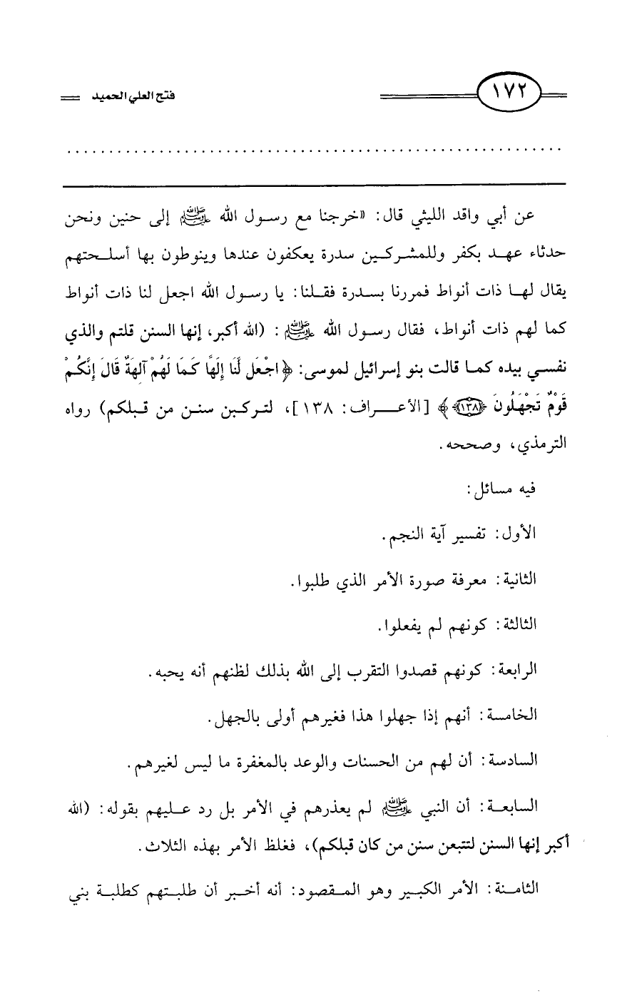 عن أبي واقد الليثي قال: «خرجنا مع رسول الله - صلى الله عليه وسلم - إلى حنين ونحن حدثاء عهد بكفر وللمشركين سدرة يعكفون عندها وينوطون بها أسلحتهم يقال لها ذات أنواط فمررنا بسدرة فقلنا: يا رسول الله اجعل لنا ذات أنواط كما لهم ذات أنواط، فقال رسول الله - صلى الله عليه وسلم -: «الله أكبر، إنها السنن قلتم والذي نفسي بيده كما قالت بنو إسرائيل لموسى: {اجْعَلْ لَنَا إِلَهًا كَمَا لَهُمْ آَلِهَةٌ قَالَ إِنَّكُمْ قَوْمٌ تَجْهَلُونَ} [الأعراف: 138]، لتركبن سنن من قبلكم» رواه الترمذي، وصححه.