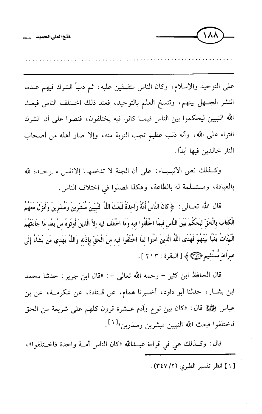 قال الله تعالى: {كَانَ النَّاسُ أُمَّةً وَاحِدَةً فَبَعَثَ اللَّهُ النَّبِيِّينَ مُبَشِّرِينَ وَمُنْذِرِينَ وَأَنْزَلَ مَعَهُمُ الْكِتَابَ بِالْحَقِّ لِيَحْكُمَ بَيْنَ النَّاسِ فِيمَا اخْتَلَفُوا فِيهِ وَمَا اخْتَلَفَ فِيهِ إِلاَّ الَّذِينَ أُوتُوهُ مِنْ بَعْدِ مَا جَاءَتْهُمُ الْبَيِّنَاتُ بَغْيًا بَيْنَهُمْ فَهَدَى اللَّهُ الَّذِينَ آَمَنُوا لِمَا اخْتَلَفُوا فِيهِ مِنَ الْحَقِّ بِإِذْنِهِ وَاللَّهُ يَهْدِي مَنْ يَشَاءُ إِلَى صِرَاطٍ مُسْتَقِيمٍ}