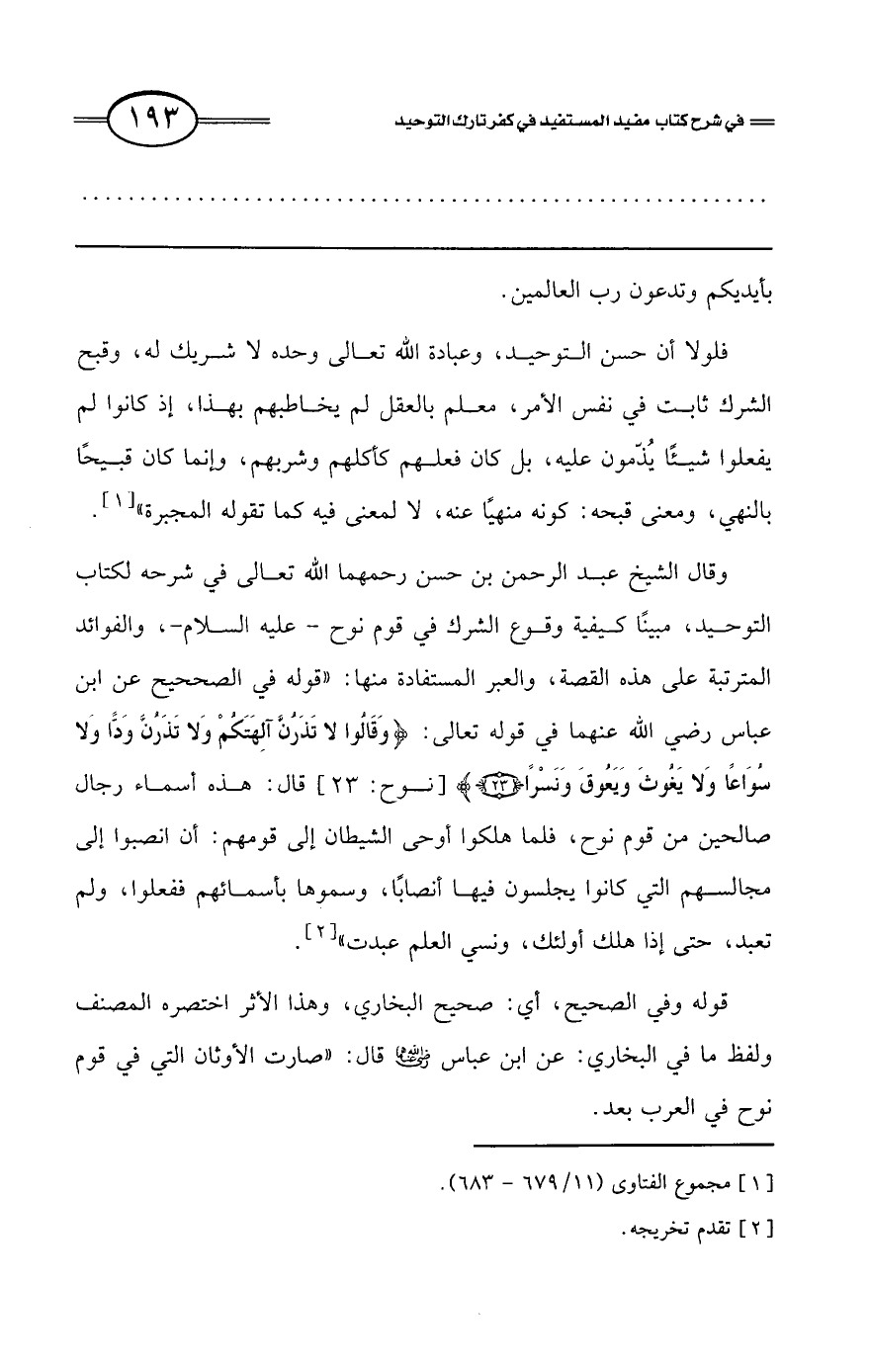 وقال الشيخ عبد الرحمن بن حسن رحمهما الله تعالى في شرحه لكتاب التوحيد، مبينًا كيفية وقوع الشرك في قوم نوح -عليه السلام-، والفوائد المترتبة على هذه القصة، والعبر المستفادة منها: «قوله في الصحيح عن ابن عباس رضي الله عنهما في قوله تعالى: {وَقَالُوا لاَ تَذَرُنَّ آَلِهَتَكُمْ وَلاَ تَذَرُنَّ وَدًّا وَلاَ سُوَاعًا وَلاَ يَغُوثَ وَيَعُوقَ وَنَسْرًا} [نوح: 23] قال: هذه أسماء رجال صالحين من قوم نوح، فلما هلكوا أوحى الشيطان إلى قومهم: أن انصبوا إلى مجالسهم التي كانوا يجلسون فيها أنصابًا، وسموها بأسمائهم ففعلوا، ولم تعبد، حتى إذا هلك أولئك، ونسي العلم عبدت» (¬2).
