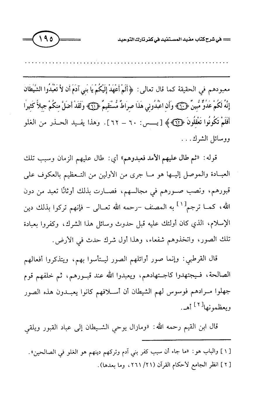 معبودهم في الحقيقة كما قال تعالى: {أَلَمْ أَعْهَدْ إِلَيْكُمْ يَا بَنِي آَدَمَ أَنْ لاَ تَعْبُدُوا الشَّيْطَانَ إِنَّهُ لَكُمْ عَدُوٌّ مُبِينٌ * وَأَنِ اعْبُدُونِي هَذَا صِرَاطٌ مُسْتَقِيمٌ * وَلَقَدْ أَضَلَّ مِنْكُمْ جِبِلًّا كَثِيرًا أَفَلَمْ تَكُونُوا تَعْقِلُونَ} [يس: 60 - 62]. وهذا يفيد الحذر من الغلو ووسائل الشرك ..