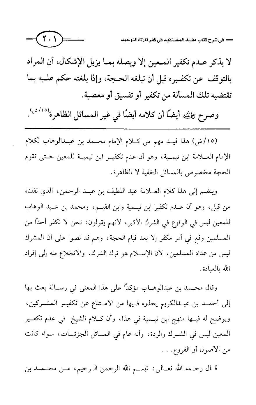 (15/ش) هذا قيد مهم من كلام الإمام محمد بن عبد الوهاب لكلام الإمام العلامة ابن تيمية، وهو أن عدم تكفير ابن تيمية للمعين حتى تقوم الحجة مخصوص بالمسائل الخفية لا الظاهرة.