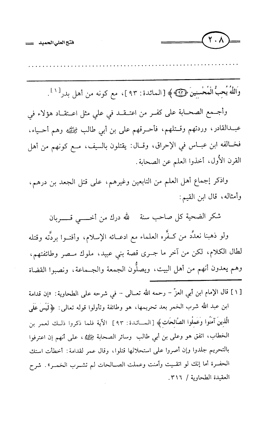 (¬1) قال الإمام ابن أبي العز -رحمه الله تعالى- في شرحه على الطحاوية: «إن قدامة ابن عبد الله شرب الخمر بعد تحريمها، هو وطائفة وتأولوا قوله تعالى: {لَيْسَ عَلَى الَّذِينَ آَمَنُوا وَعَمِلُوا الصَّالِحَاتِ} [المائدة: 93] الآية فلما ذكروا ذلك لعمر بن الخطاب، اتفق هو وعلي بن أبي طالب وسائر الصحابة رضي الله عنهم، على أنهم إن اعترفوا بالتحريم جلدوا وإن أصروا على استحلالها قتلوا، وقال عمر لقدامة: أخطأت استك الحفرة أما إنك لو اتقيت وآمنت وعملت الصالحات لم تشرب الخمر» شرح العقيدة الطحاوية /316.