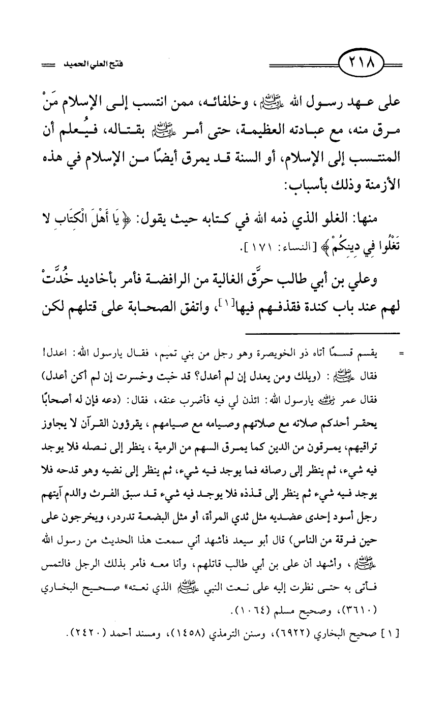 على عهد رسول الله - صلى الله عليه وسلم -، وخلفائه، ممن انتسب إلى الإسلام مَنْ مرق منه، مع عبادته العظيمة، حتى أمر - صلى الله عليه وسلم - بقتاله، فيعلم أن المنتسب إلى الإسلام، أو السنة قد يمرق أيضًا من الإسلام في هذه الأزمنة وذلك
