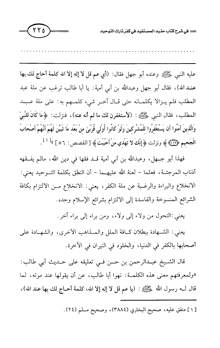 قال الشيخ عبد الرحمن بن حسن في تعليقه على حديث أبي طالب: «ولمعرفتهم معنى هذه الكلمة: نهوا أبا طالب، عن أن يقولها عند موته، لما قال له رسول الله - صلى الله عليه وسلم -: «يا عم قل لا إله إلا الله، كلمة أحاج لك بها عند الله»،