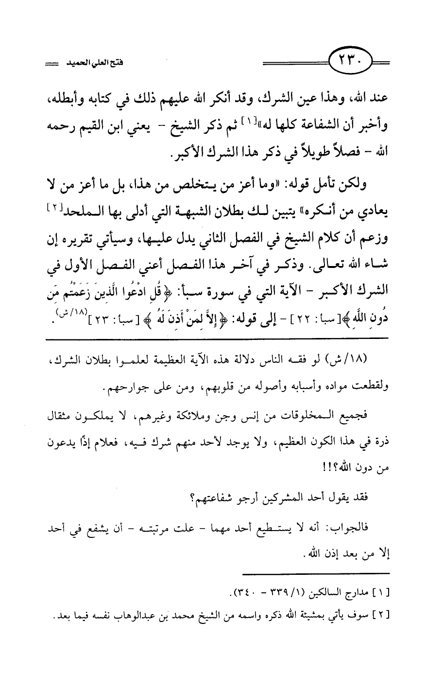 ولكن تأمل قوله: «وما أعز من يتخلص من هذا، بل ما أعز من لا يعادي من أنكره» يتبين لك بطلان الشبهة التي أدلى بها الملحد (¬2) وزعم أن كلام الشيخ في الفصل الثاني يدل عليها، وسيأتي تقريره إن شاء الله تعالى. وذكر في آخر هذا الفصل أعني الفصل الأول في الشرك الأكبر -الآية التي في سورة سبأ: {قُلِ ادْعُوا الَّذِينَ زَعَمْتُمْ مِنْ دُونِ اللَّهِ} [سبأ: 22]- إلى قوله: {إِلاَّ لِمَنْ أَذِنَ لَهُ} [سبأ: 23] (18/ش).