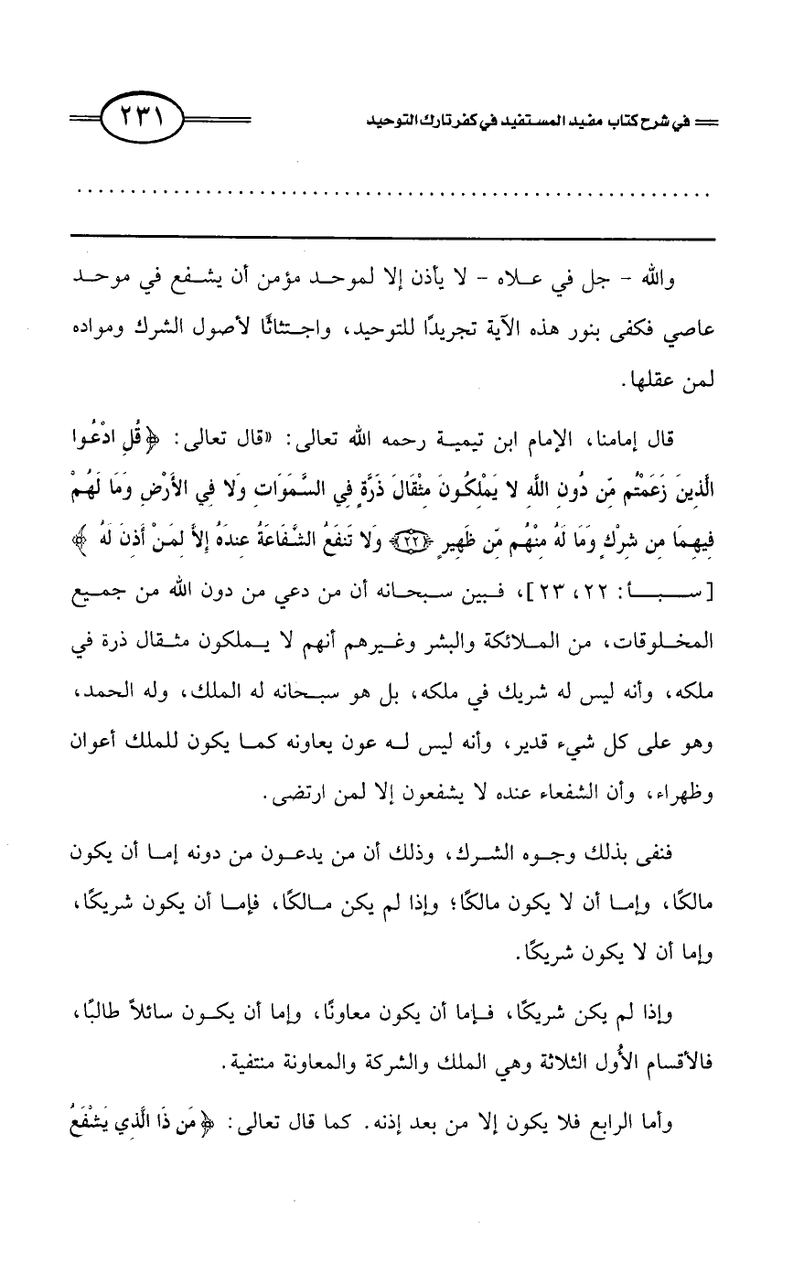قال إمامنا، الإمام ابن تيمية رحمه الله تعالى: «قال تعالى: {قُلِ ادْعُوا الَّذِينَ زَعَمْتُمْ مِنْ دُونِ اللَّهِ لاَ يَمْلِكُونَ مِثْقَالَ ذَرَّةٍ فِي السَّمَاوَاتِ وَلاَ فِي الأَرْضِ وَمَا لَهُمْ فِيهِمَا مِنْ شِرْكٍ وَمَا لَهُ مِنْهُمْ مِنْ ظَهِيرٍ * وَلاَ تَنْفَعُ الشَّفَاعَةُ عِنْدَهُ إِلاَّ لِمَنْ أَذِنَ لَهُ} [سبأ: 22، 23]، فبين سبحانه أن من دعي من دون الله من جميع المخلوقات، من الملائكة والبشر وغيرهم أنهم لا يملكون مثقال ذرة في ملكه، وأنه ليس له شريك في ملكه، بل هو سبحانه له الملك، وله الحمد، وهو على كل شيء قدير، وأنه ليس له عون يعاونه كما يكون للملك أعوان وظهراء، وأن الشفعاء عنده لا يشفعون إلا لمن ارتضى.