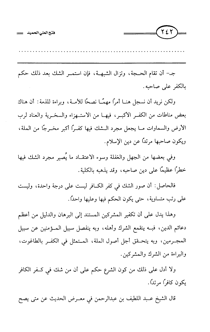 جـ- أن تقام الحجة، وتزال الشبهة، فإن استمر الشك بعد ذلك حكم بالكفر على صاحبه.