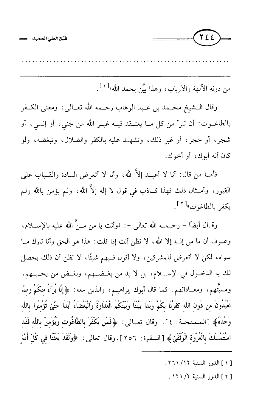 وقال أيضًا -رحمه الله تعالى-: «وأنت يا من منَّ الله عليه بالإسلام، وعرف أن ما من إله إلا الله، لا تظن أنك إذا قلت: هذا هو الحق وأنا تارك ما سواه، لكن لا أتعرض للمشركين، ولا أقول فيهم شيئًا، لا تظن أن ذلك يحصل لك به الدخول في الإسلام، بل لا بد من بغضهم، وبغض من يحبهم، ومسبتهم، ومعاداتهم. كما قال أبوك إبراهيم، والذين معه: {إِنَّا بُرَآَءُ مِنْكُمْ وَمِمَّا تَعْبُدُونَ مِنْ دُونِ اللَّهِ كَفَرْنَا بِكُمْ وَبَدَا بَيْنَنَا وَبَيْنَكُمُ الْعَدَاوَةُ وَالْبَغْضَاءُ أَبَدًا حَتَّى تُؤْمِنُوا بِاللَّهِ وَحْدَهُ} [الممتحنة: 4]، وقال تعالى: {فَمَنْ يَكْفُرْ بِالطَّاغُوتِ وَيُؤْمِنْ بِاللَّهِ فَقَدِ اسْتَمْسَكَ بِالْعُرْوَةِ الْوُثْقَى} [البقرة: 256]. وقال تعالى: {وَلَقَدْ بَعَثْنَا فِي كُلِّ أُمَّةٍ