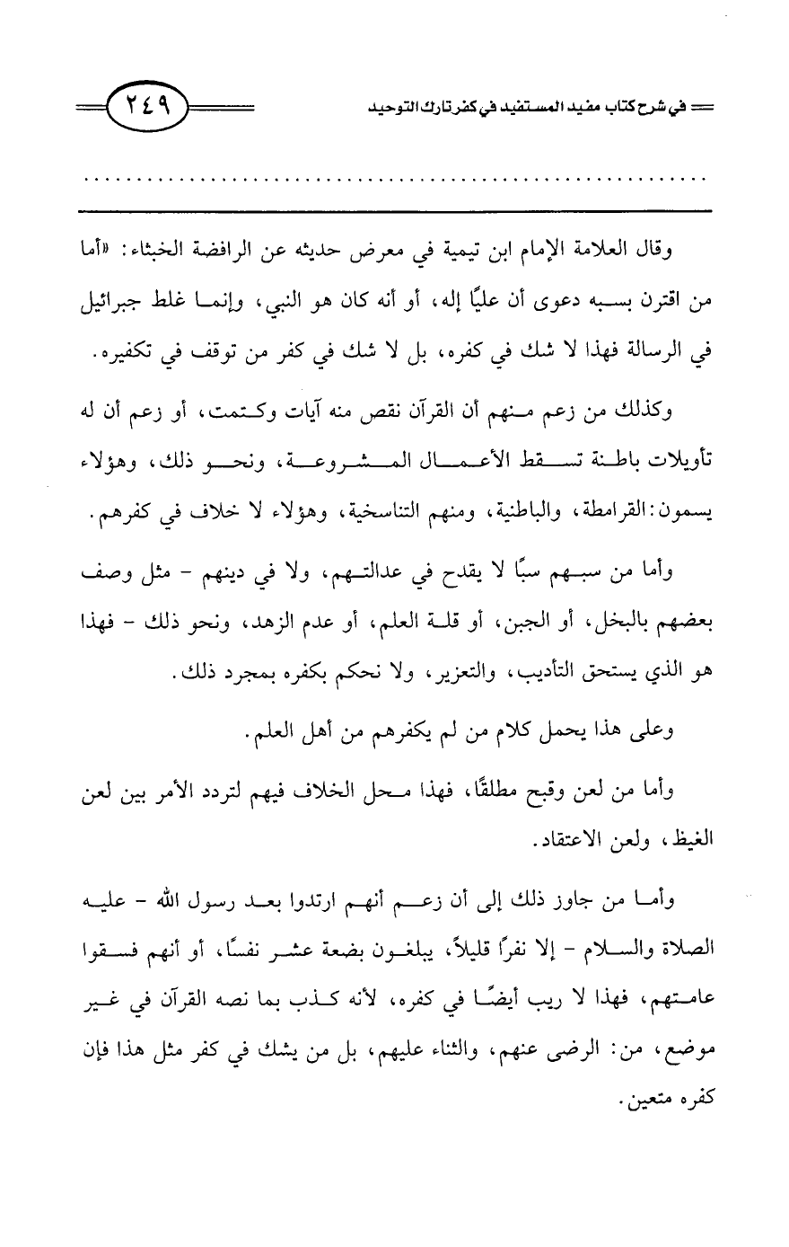 وقال العلامة الإمام ابن تيمية في معرض حديثه عن الرافضة الخبثاء: «أما من اقترن بسبه دعوى أن عليًا إله، أو أنه كان هو النبي، وإنما غلط جبرائيل في الرسالة فهذا لا شك في كفره، بل لا شك في كفر من توقف في تكفيره.