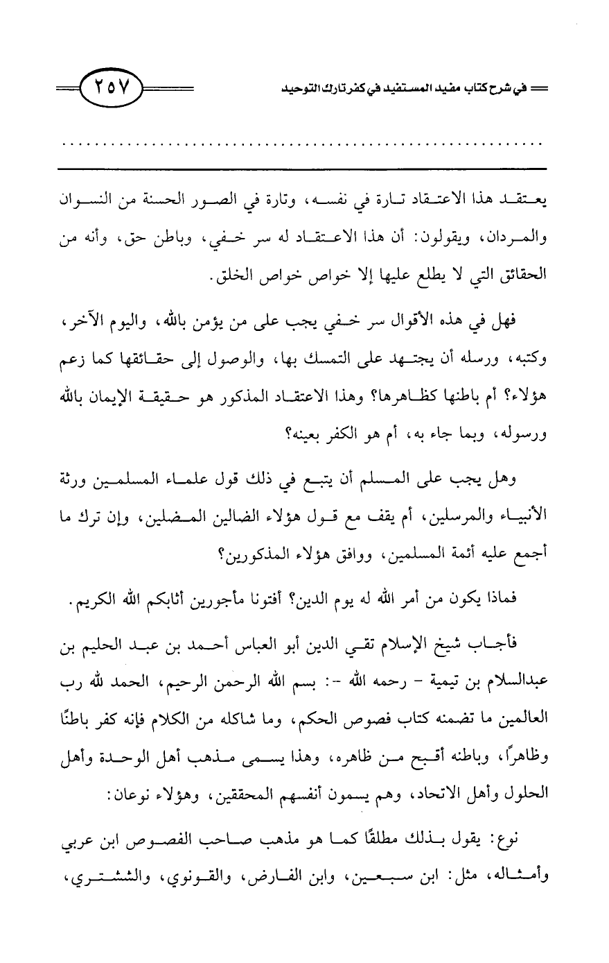 فأجاب شيخ الإسلام تقي الدين أبو العباس أحمد بن عبد الحليم بن عبد السلام بن تيمية -رحمه الله-: بسم الله الرحمن الرحيم، الحمد لله رب العالمين ما تضمنه كتاب فصوص الحكم، وما شاكله من الكلام فإنه كفر باطنًا وظاهرًا، وباطنه أقبح من ظاهره، وهذا يسمى مذهب أهل الوحدة وأهل الحلول وأهل الاتحاد، وهم يسمون أنفسهم المحققين، وهؤلاء نوعان: