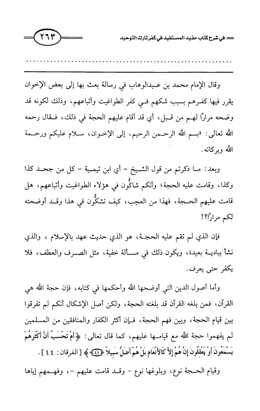 وقال الإمام محمد بن عبد الوهاب في رسالة بعث بها إلى بعض الإخوان يقرر فيها كفرهم بسبب شكهم في كفر الطواغيت وأتباعهم، وذلك لكونه قد وضحه مرارًا لهم من قبل، أي قد أقام عليهم الحجة في ذلك، فقال رحمه الله تعالى: «بسم الله الرحمن الرحيم، إلى الإخوان، سلام عليكم ورحمة الله