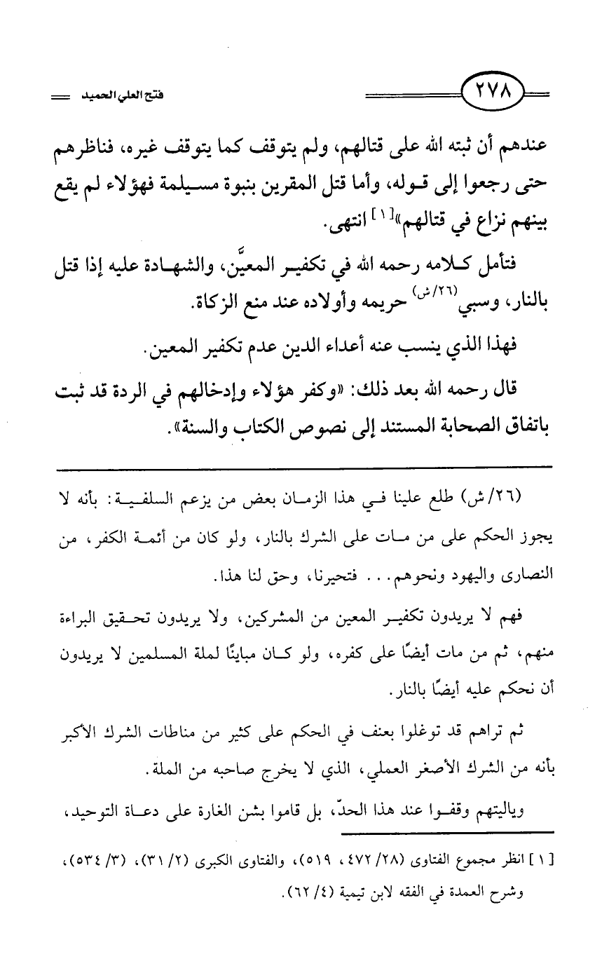 فتأمل كلامه -رحمه الله- في تكفير المعين، والشهادة عليه إذا قتل بالنار، وسبي (26/ش) حريمه وأولاده عند منع الزكاة.