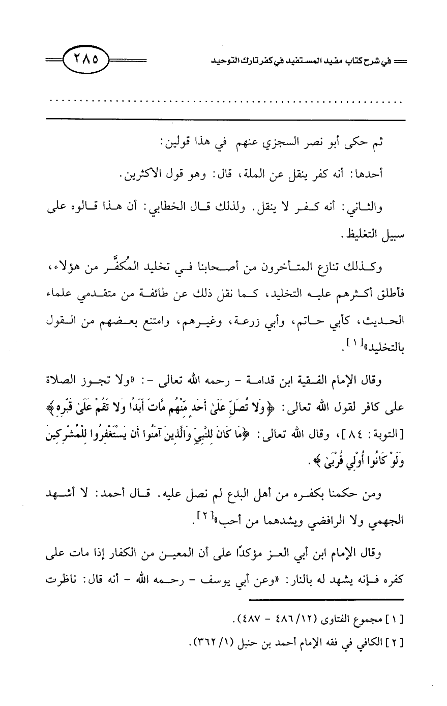 وكذلك تنازع المتأخرون من أصحابنا في تخليد المكفر من هؤلاء، فأطلق أكثرهم عليه التخليد، كما نقل ذلك عن طائفة من متقدمي علماء الحديث، كأبي حاتم، وأبي زرعة، وغيرهم، وامتنع بعضهم من القول بالتخليد» (¬1).