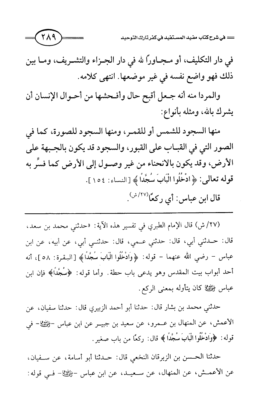 (27/ش) قال الإمام الطبري في تفسير هذه الآية: «حدثني محمد بن سعد، قال: حدثني أبي، قال: حدثني عمي، قال: حدثني أبي، عن أبيه، عن ابن عباس رضي الله عنهما قوله: {وَادْخُلُوا الْبَابَ سُجَّدًا} [البقرة: 58] أنه أحد أبوب بيت المقدس وهو يدعى باب حطة. وأما قوله: {سُجَّدًا} فإن ابن عباس رضي الله عنهما كان يتأوله بمعنى الركع.