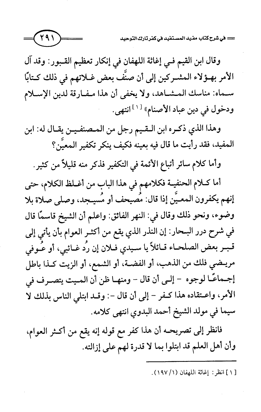 أما كلام الحنفية فكلامهم في هذا الباب من أغلظ الكلام، حتى إنهم يكفرون المعين إذا قال: مصيحف أو مسيجد، وصلى صلاة بلا وضوء، ونحو ذلك وقال في: النهر الفائق، واعلم أن الشيخ قاسما قال في شرح درر البحار: إن النذر الذي يقع من أكثر العوام بأن يأتي إلى قبر بعض الصلحاء قائلا يا سيدي فلان إن رد غائبي، أو عوفي مريضي فلك من الذهب، أو الفضة، أو الشمع، أو الزيت كذا باطل إجماعًا لوجوه -إلى أن قال- ومنها ظن أن الميت يتصرف في الأمر، واعتقاده هذا كفر -إلى أن قال-: وقد ابتلي الناس بذلك لا سيما في مولد الشيخ أحمد البدوي انتهى كلامه.