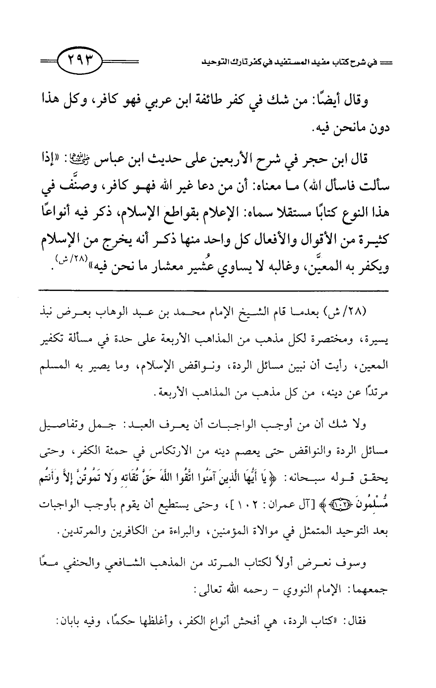 (28/ش) بعدما قام الشيخ الإمام محمد بن عبد الوهاب بعرض نبذ يسيرة، ومختصرة لكل مذهب من المذاهب الأربعة على حدة في مسألة تكفير المعين، رأيت أن نبين مسائل الردة، ونواقض الإسلام، وما يصير به المسلم مرتدًا عن دينه، من كل مذهب من المذاهب الأربعة.