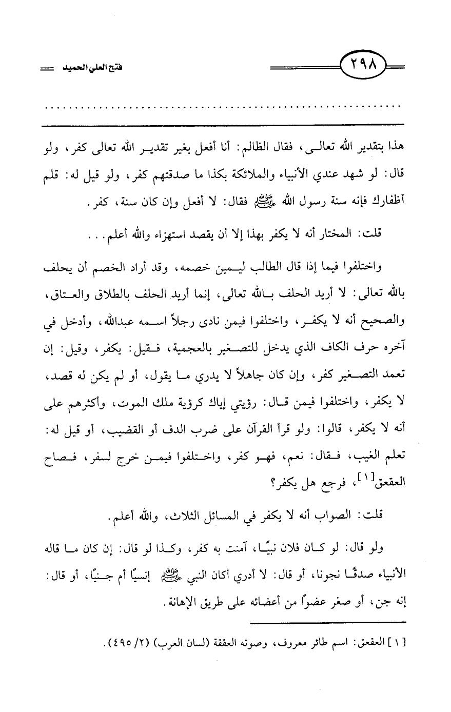 واختلفوا فيما إذا قال الطالب ليمين خصمه، وقد أراد الخصم أن يحلف بالله تعالى: لا أريد الحلف بالله تعالى، إنما أريد الحلف بالطلاق والعتاق، والصحيح أنه لا يكفر، واختلفوا فيمن نادى رجلاً اسمه عبد الله، وأدخل في آخره حرف الكاف الذي يدخل للتصغير بالعجمية، فقيل: يكفر، وقيل: إن تعمد التصغير كفر، وإن كان جاهلاً لا يدري ما يقول، أو لم يكن له قصد، لا يكفر، واختلفوا فيمن قال: رؤيتي إياك كرؤية ملك الموت، وأكثرهم على أنه لا يكفر، قالوا: ولو قرأ القرآن على ضرب الدف أو القضيب، أو قيل له: تعلم الغيب، فقال: نعم، فهو كفر، واختلفوا فيمن خرج لسفر، فصاح العقعق (¬1) فرجع هل يكفر؟
