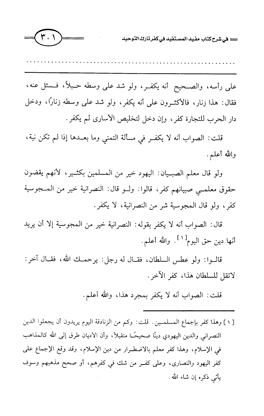 (¬1) وهذا كفر بإجماع المسلمين. قلت: وكم من الزنادقة اليوم يريدون أن يجعلوا الدين النصراني والدين اليهودي دينًا صحيحًا متقبلاً، وأن الأديان طرق إلى الله كالمذاهب في الإسلام، وهذا كفر معلم بالاضطرار من دين الإسلام، وقد وقع الإجماع على كفر اليهود والنصارى، وعلى كفر من شك في كفرهم، أو صحح مذهبهم وسوف يأتي ذكره إن شاء الله.