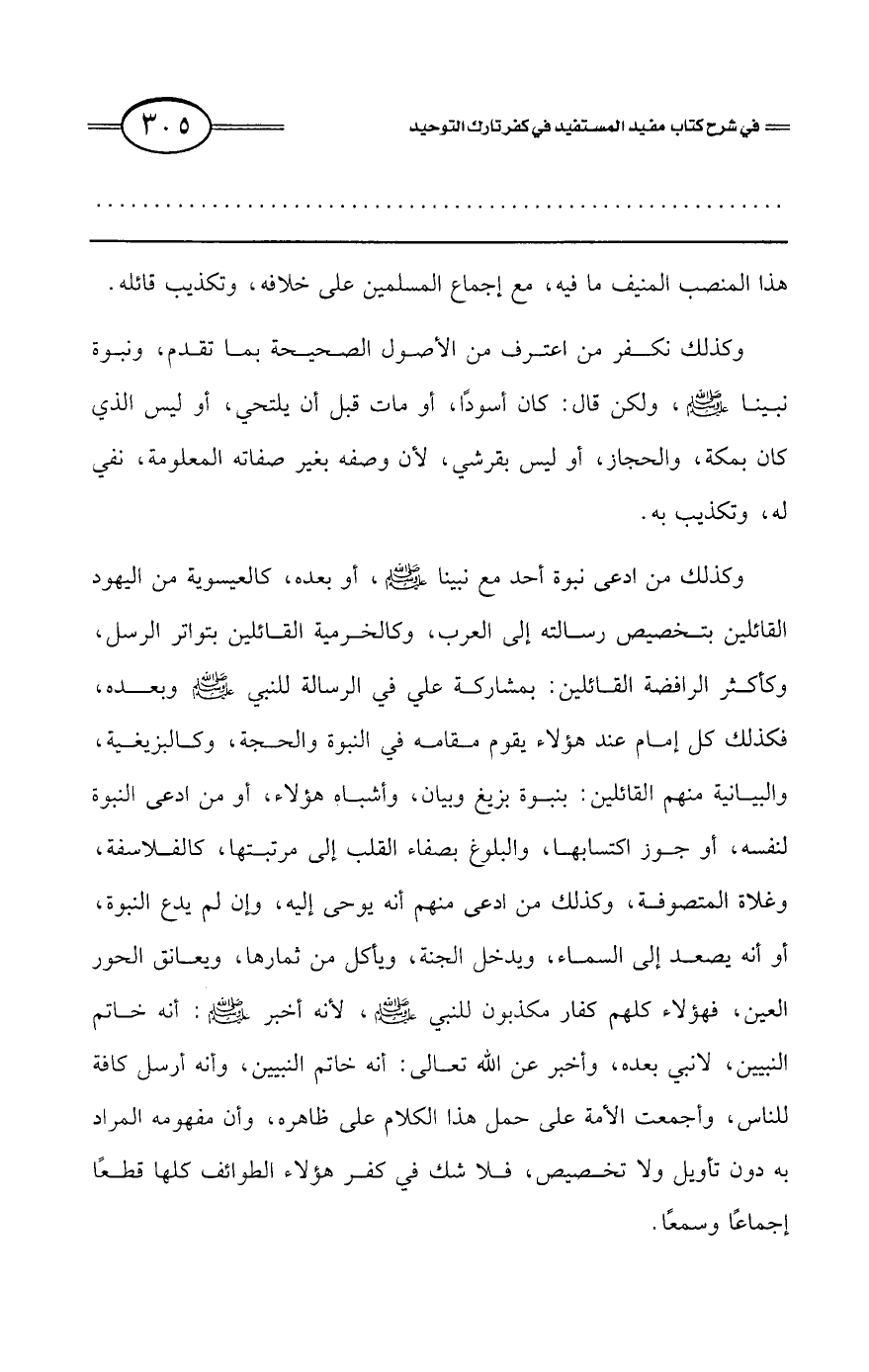 وكذلك نكفر من اعترف من الأصول الصحيحة بما تقدم، ونبوة نبينا - صلى الله عليه وسلم - ولكن قال: كان أسودًا، أو مات قبل أن يلتحي، أو ليس الذي كان بمكة، والحجاز، أو ليس بقرشي، لأن وصفه بغير صفاته المعلومة، نفي له، وتكذيب به.