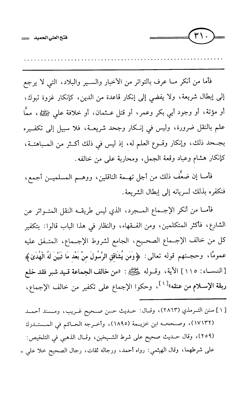 فأما من أنكر الإجماع المجرد، الذي ليس طريقه النقل المتواتر عن الشارع، فأكثر المتكلمين، ومن الفقهاء، والنظار في هذا الباب قالوا: بتكفير كل من خالف الإجماع الصحيح، الجامع لشروط الإجماع، المتفق عليه عمومًا، وحجتهم قوله تعالى: {وَمَنْ يُشَاقِقِ الرَّسُولَ مِنْ بَعْدِ مَا تَبَيَّنَ لَهُ الْهُدَى} [النساء: 115] الآية، وقوله - صلى الله عليه وسلم -: «من خالف الجماعة قيد شبر فقد خلع ربقة الإسلام من عنقه» (¬1) وحكوا الإجماع على تكفير من خالف الإجماع،