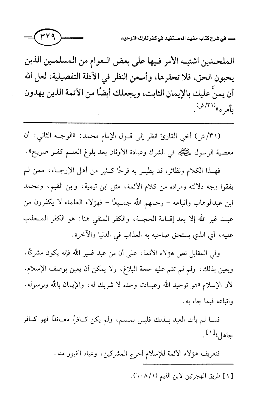 فهذا الكلام ونظائره قد يطير به فرحًا كثير من أهل الإرجاء، ممن لم يفقهوا وجه دلالته ومراده من كلام الأئمة، مثل ابن تيمية، وابن القيم، ومحمد بن عبد الوهاب وأتباعه -رحمهم الله جميعًا- فهؤلاء العلماء لا يكفرون من عبد غير الله إلا بعد إقامة الحجة، والكفر المنفي هنا: هو الكفر المعذب عليه، أي الذي يستحق صاحبه به العذاب في الدنيا والآخرة.