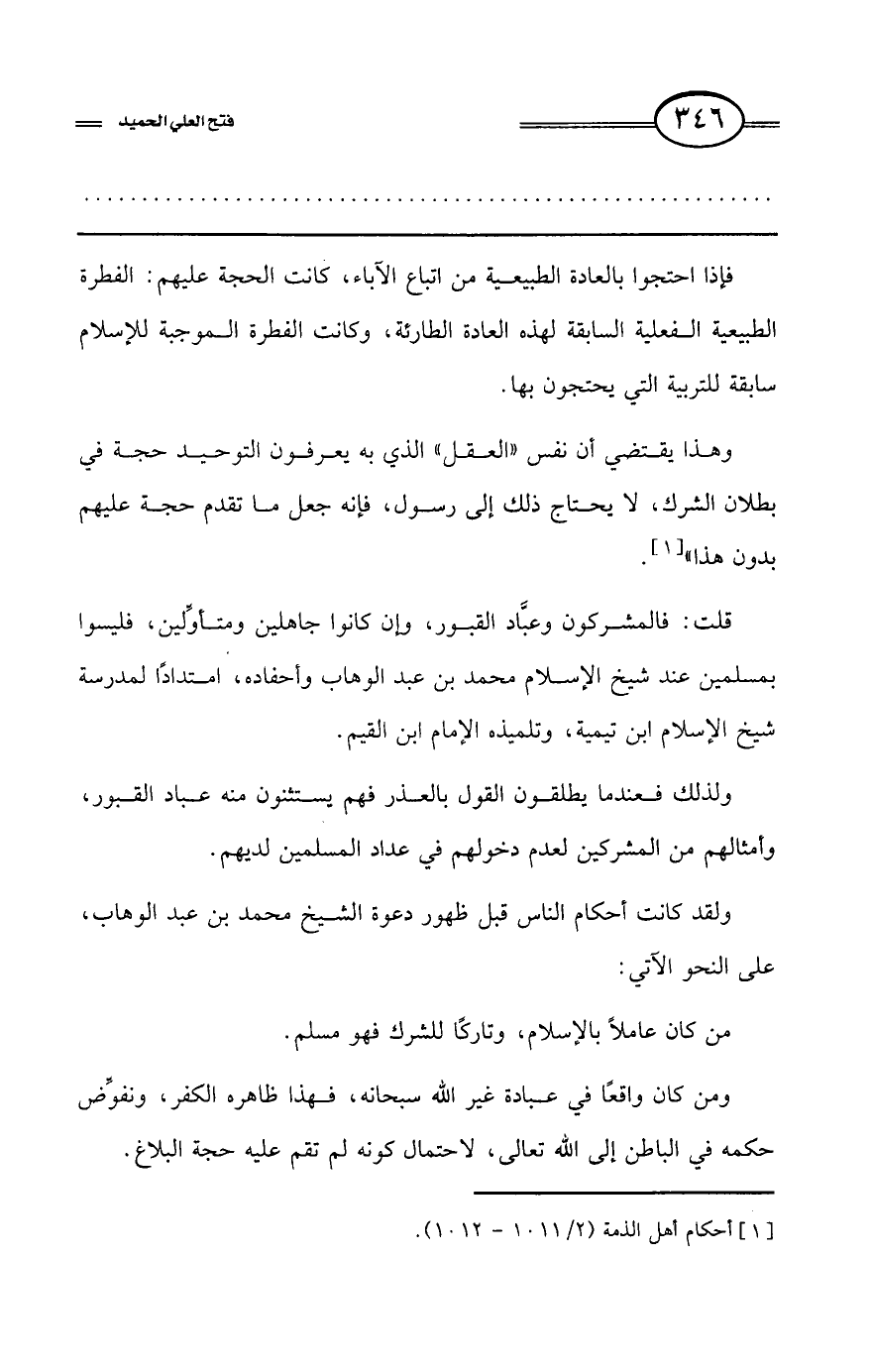 قلت: فالمشركون وعبَّاد القبور، وإن كانوا جاهلين ومتأولين، فليسوا بمسلمين عند شيخ الإسلام محمد بن عبد الوهاب وأحفاده، امتدادًا لمدرسة شيخ الإسلام ابن تيمية، وتلميذه الإمام ابن القيم.