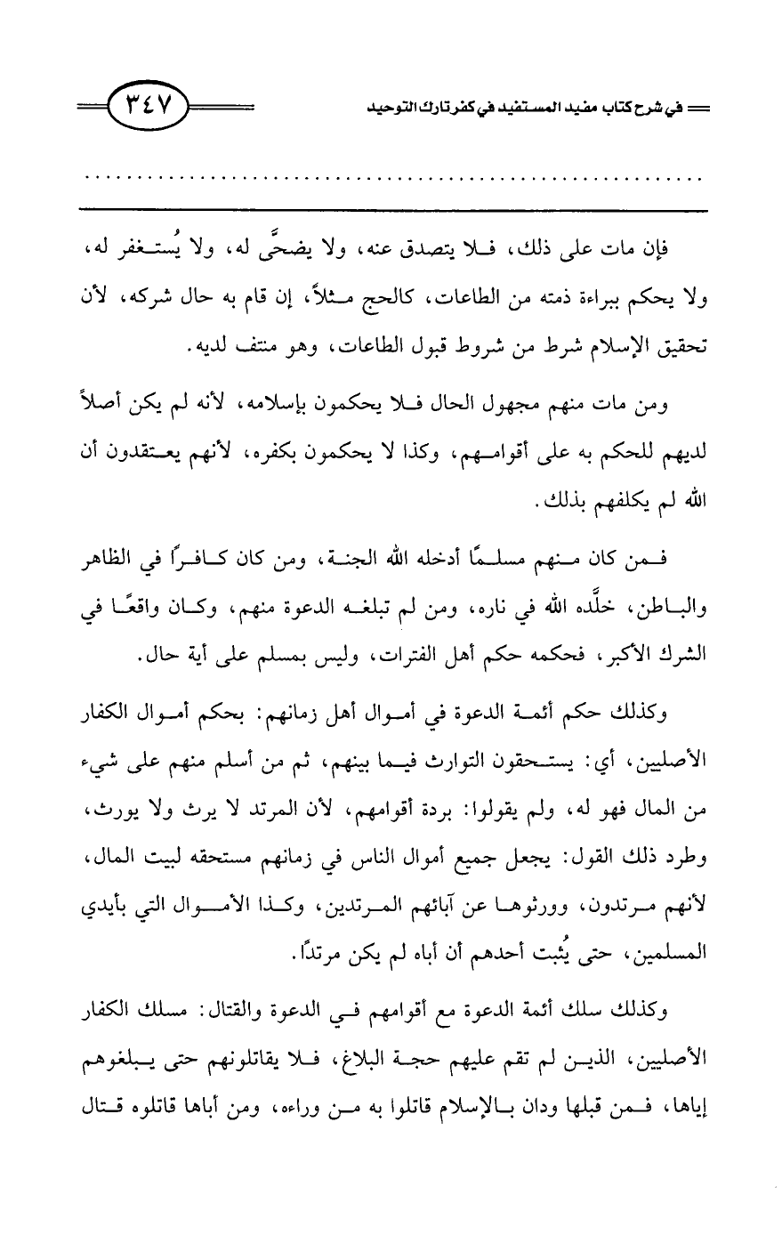 وكذلك حكم أئمة الدعوة في أموال أهل زمانهم: بحكم أموال الكفار الأصليين، أي: يستحقون التوارث فيما بينهم، ثم من أسلم منهم على شيء من المال فهو له، ولم يقولوا: بردة أقوامهم، لأن المرتد لا يرث ولا يورث، وطرد ذلك القول: يجعل جميع أموال الناس في زمانهم مستحقة لبيت المال، لأنهم مرتدون، وورثوها عن آبائهم المرتدين، وكذا الأموال التي بأيدي المسلمين، حتى يثبت أحدهم أن أباه لم يكن مرتدًا.
