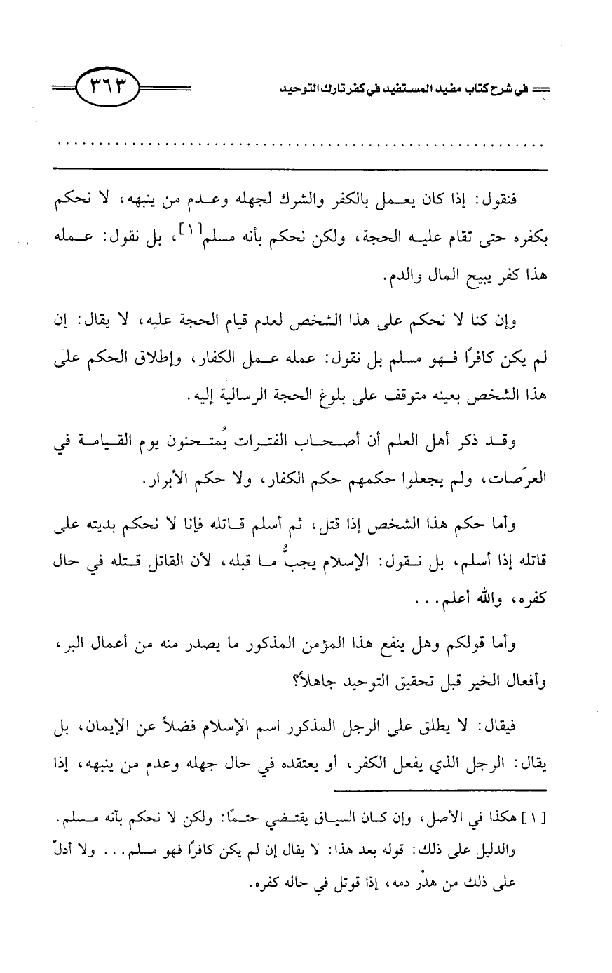 وإن كنا لا نحكم على هذا الشخص لعدم قيام الحجة عليه، لا يقال: إن لم يكن كافرًا فهو مسلم بل نقول: عمله عمل الكفار، وإطلاق الحكم على هذا الشخص بعينه متوقف على بلوغ الحجة الرسالية إليه.