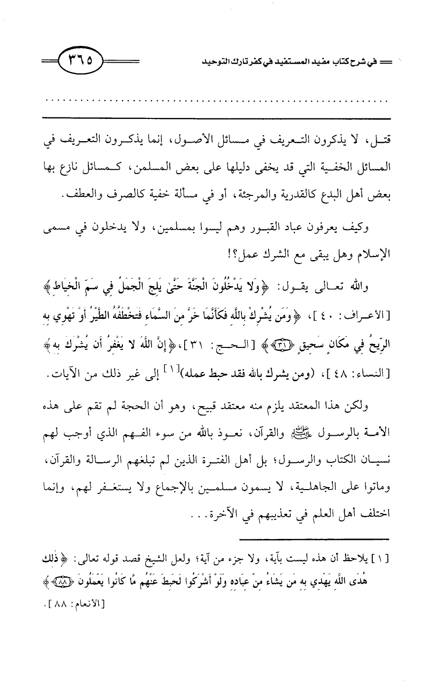 (¬1) يلاحظ أن هذه ليست بآية، ولا جزء من آية؛ ولعل الشيخ قصد قوله تعالى: {ذَلِكَ هُدَى اللَّهِ يَهْدِي بِهِ مَنْ يَشَاءُ مِنْ عِبَادِهِ وَلَوْ أَشْرَكُوا لَحَبِطَ عَنْهُمْ مَا كَانُوا يَعْمَلُونَ} [الأنعام: 88].