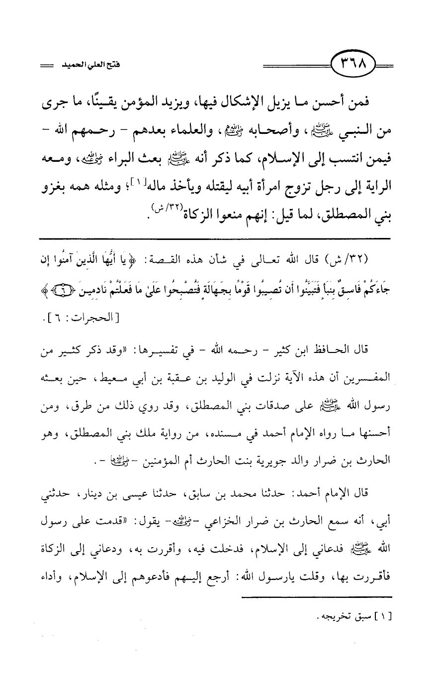 النبي - صلى الله عليه وسلم - وأصحابه رضي الله عنهم، والعلماء بعدهم -رحمهم الله- فيمن انتسب إلى الإسلام، كما ذكر أنه - صلى الله عليه وسلم - بعث البراء - رضي الله عنه -، ومعه الراية إلى رجل تزوج امرأة أبيه ليقتله ويأخذ ماله (¬1)، ومثله همه بغزو بني المصطلق، لما قيل: إنهم منعوا الزكاة (32/ش).