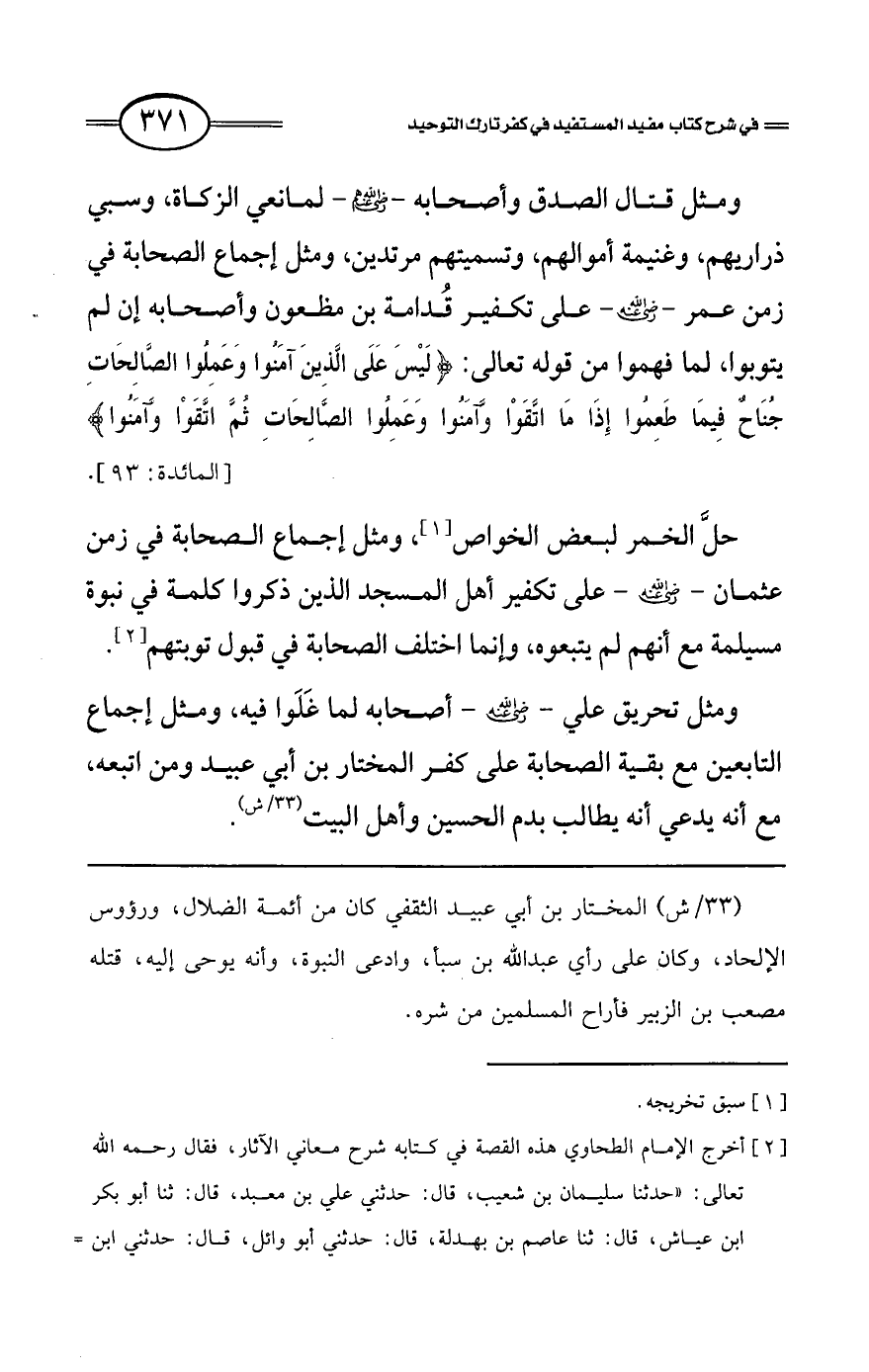 ومثل تحريق علي - رضي الله عنه - أصحابه لما غلوا فيه، ومثل إجماع التابعين مع بقية الصحابة على كفر المختار بن أبي عبيد ومن اتبعه، مع أنه يدعي أنه يطالب بدم الحسين وأهل البيت (33/ش).
