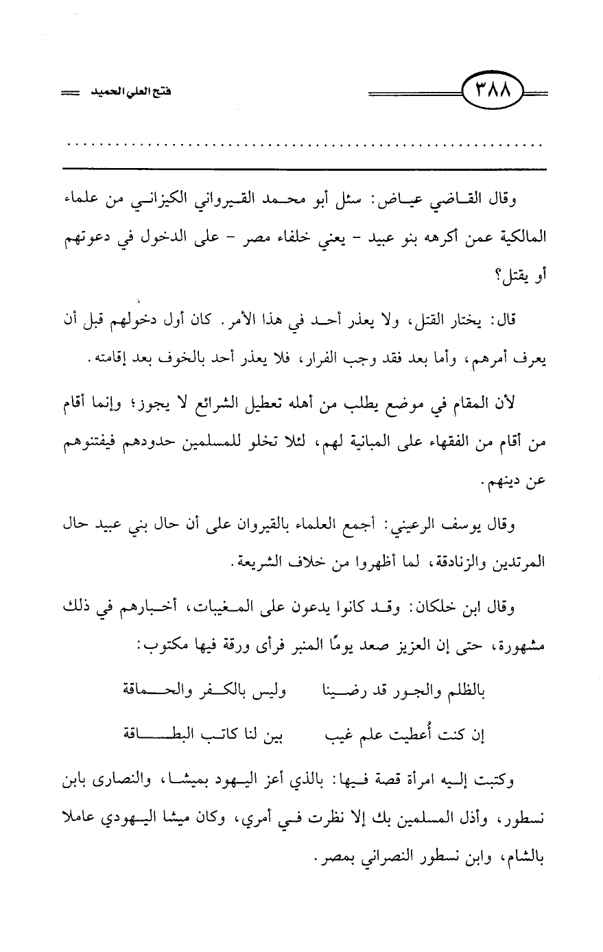 وقال القاضي عياض: سئل أبو محمد القيرواني الكيزاني من علماء المالكية عمن أكرهه بنو عبيد -يعني خلفاء مصر- على الدخول في دعوتهم أو يقتل؟