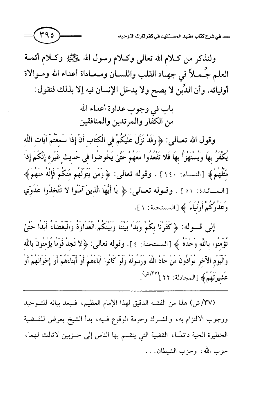 إلى قوله: {كَفَرْنَا بِكُمْ وَبَدَا بَيْنَنَا وَبَيْنَكُمُ الْعَدَاوَةُ وَالْبَغْضَاءُ أَبَدًا حَتَّى تُؤْمِنُوا بِاللَّهِ وَحْدَهُ} [الممتحنة: 4]، وقوله تعالى: {لاَ تَجِدُ قَوْمًا يُؤْمِنُونَ بِاللَّهِ وَالْيَوْمِ الْآَخِرِ يُوَادُّونَ مَنْ حَادَّ اللَّهَ وَرَسُولَهُ وَلَوْ كَانُوا آَبَاءَهُمْ أَوْ أَبْنَاءَهُمْ أَوْ إِخْوَانَهُمْ أَوْ عَشِيرَتَهُمْ} [المجادلة: 22] (37/ش).