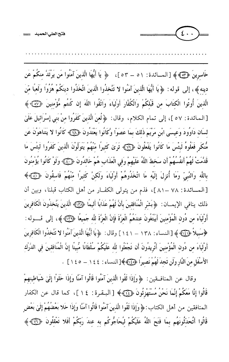 خَاسِرِينَ} [المائدة: 51 - 53]، {يَا أَيُّهَا الَّذِينَ آَمَنُوا مَنْ يَرْتَدَّ مِنْكُمْ عَنْ دِينِهِ} إلى قوله: {يَا أَيُّهَا الَّذِينَ آَمَنُوا لاَ تَتَّخِذُوا الَّذِينَ اتَّخَذُوا دِينَكُمْ هُزُوًا وَلَعِبًا مِنَ الَّذِينَ أُوتُوا الْكِتَابَ مِنْ قَبْلِكُمْ وَالْكُفَّارَ أَوْلِيَاءَ وَاتَّقُوا اللَّهَ إِنْ كُنْتُمْ مُؤْمِنِينَ} [المائدة: 57] إلى تمام الكلام، وقال: {لُعِنَ الَّذِينَ كَفَرُوا مِنْ بَنِي إِسْرَائِيلَ عَلَى لِسَانِ دَاوُودَ وَعِيسَى ابْنِ مَرْيَمَ ذَلِكَ بِمَا عَصَوْا وَكَانُوا يَعْتَدُونَ * كَانُوا لاَ يَتَنَاهَوْنَ عَنْ مُنْكَرٍ فَعَلُوهُ لَبِئْسَ مَا كَانُوا يَفْعَلُونَ * تَرَى كَثِيرًا مِنْهُمْ يَتَوَلَّوْنَ الَّذِينَ كَفَرُوا لَبِئْسَ مَا قَدَّمَتْ لَهُمْ أَنْفُسُهُمْ أَنْ سَخِطَ اللَّهُ عَلَيْهِمْ وَفِي الْعَذَابِ هُمْ خَالِدُونَ * وَلَوْ كَانُوا يُؤْمِنُونَ بِاللَّهِ وَالنَّبِيِّ وَمَا أُنْزِلَ إِلَيْهِ مَا اتَّخَذُوهُمْ أَوْلِيَاءَ وَلَكِنَّ كَثِيرًا مِنْهُمْ فَاسِقُونَ} [المائدة: 78 - 81]، فذم من يتولى الكفار من أهل الكتاب قبلنا، وبين أن ذلك ينافي الإيمان: {بَشِّرِ الْمُنَافِقِينَ بِأَنَّ لَهُمْ عَذَابًا أَلِيمًا * الَّذِينَ يَتَّخِذُونَ الْكَافِرِينَ أَوْلِيَاءَ مِنْ دُونِ الْمُؤْمِنِينَ أَيَبْتَغُونَ عِنْدَهُمُ الْعِزَّةَ فَإِنَّ الْعِزَّةَ لِلَّهِ جَمِيعًا} إلى قوله: {سَبِيلاً} [النساء: 138 - 141]، وقال: {يَا أَيُّهَا الَّذِينَ آَمَنُوا لاَ تَتَّخِذُوا الْكَافِرِينَ أَوْلِيَاءَ مِنْ دُونِ الْمُؤْمِنِينَ أَتُرِيدُونَ أَنْ تَجْعَلُوا لِلَّهِ عَلَيْكُمْ سُلْطَانًا مُبِينًا * إِنَّ الْمُنَافِقِينَ فِي الدَّرْكِ الأَسْفَلِ مِنَ النَّارِ وَلَنْ تَجِدَ لَهُمْ نَصِيرًا} [النساء: 144 - 145].
