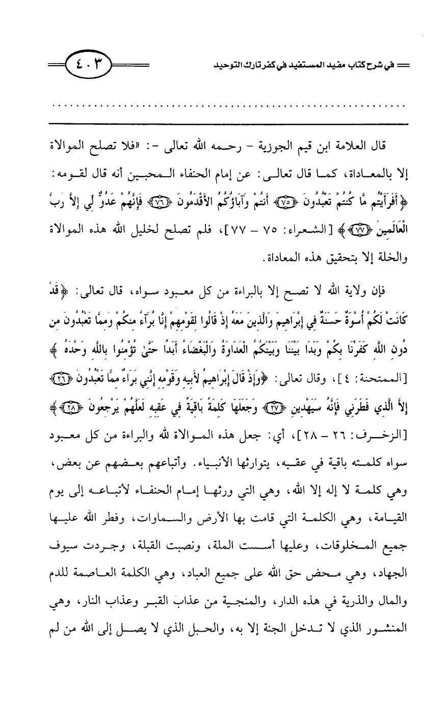 قال العلامة ابن قيم الجوزية -رحمه الله تعالى-: «فلا تصلح الموالاة إلا بالمعاداة، كما قال تعالى: عن إمام الحنفاء المحبين أنه قال لقومه: {أَفَرَأَيْتُمْ مَا كُنْتُمْ تَعْبُدُونَ * أَنْتُمْ وَآَبَاؤُكُمُ الأَقْدَمُونَ * فَإِنَّهُمْ عَدُوٌّ لِي إِلاَّ رَبَّ الْعَالَمِينَ} [الشعراء: 75 - 77] فلم تصلح لخليل الله هذه الموالاة والخلة إلا بتحقيق هذه المعاداة.