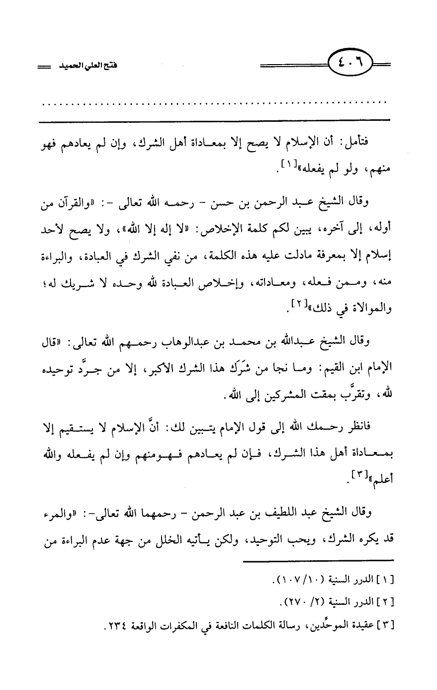 وقال الشيخ عبد اللطيف بن عبد الرحمن -رحمهما الله تعالى-: «والمرء قد يكره الشرك، ويحب التوحيد، ولكن يأتيه الخلل من جهة عدم البراءة من