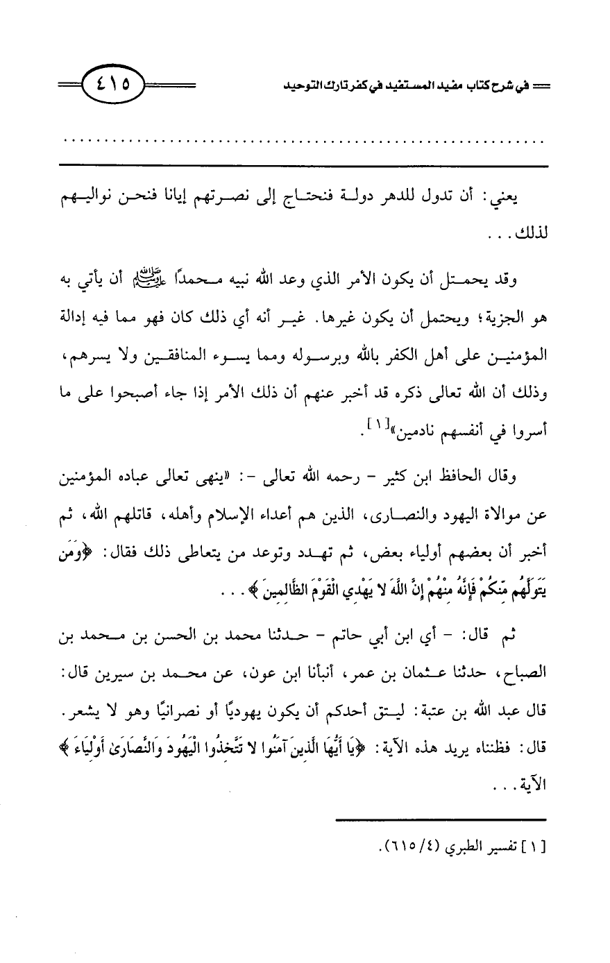 ثم قال: -أي ابن أبي حاتم- حدثنا محمد بن الحسن بن محمد بن الصباح، حدثنا عثمان بن عمر، أنبأنا ابن عون، عن محمد بن سيرين قال: قال عبد الله بن عتبة: ليتق أحدكم أن يكون يهوديًا أو نصرانيًا وهو لا يشعر. قال: فظنناه يريد هذه الآية: {يَا أَيُّهَا الَّذِينَ آَمَنُوا لاَ تَتَّخِذُوا الْيَهُودَ وَالنَّصَارَى أَوْلِيَاءَ} الآية.