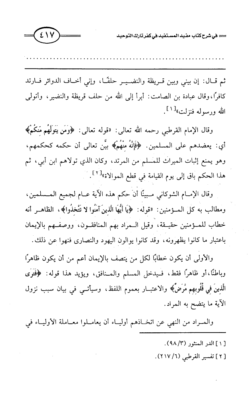 وقال الإمام القرطبي رحمه الله تعالى: «قوله تعالى: {وَمَنْ يَتَوَلَّهُمْ مِنْكُمْ} أي: يعضدهم على المسلمين {فَإِنَّهُ مِنْهُمْ} بين تعالى أن حكمه كحكمهم، وهو يمنع إثبات الميراث للمسلم من المرتد، وكان الذي تولاهم ابن أبي، ثم هذا الحكم باق إلى يوم القيامة في قطع الموالاة» (¬2).