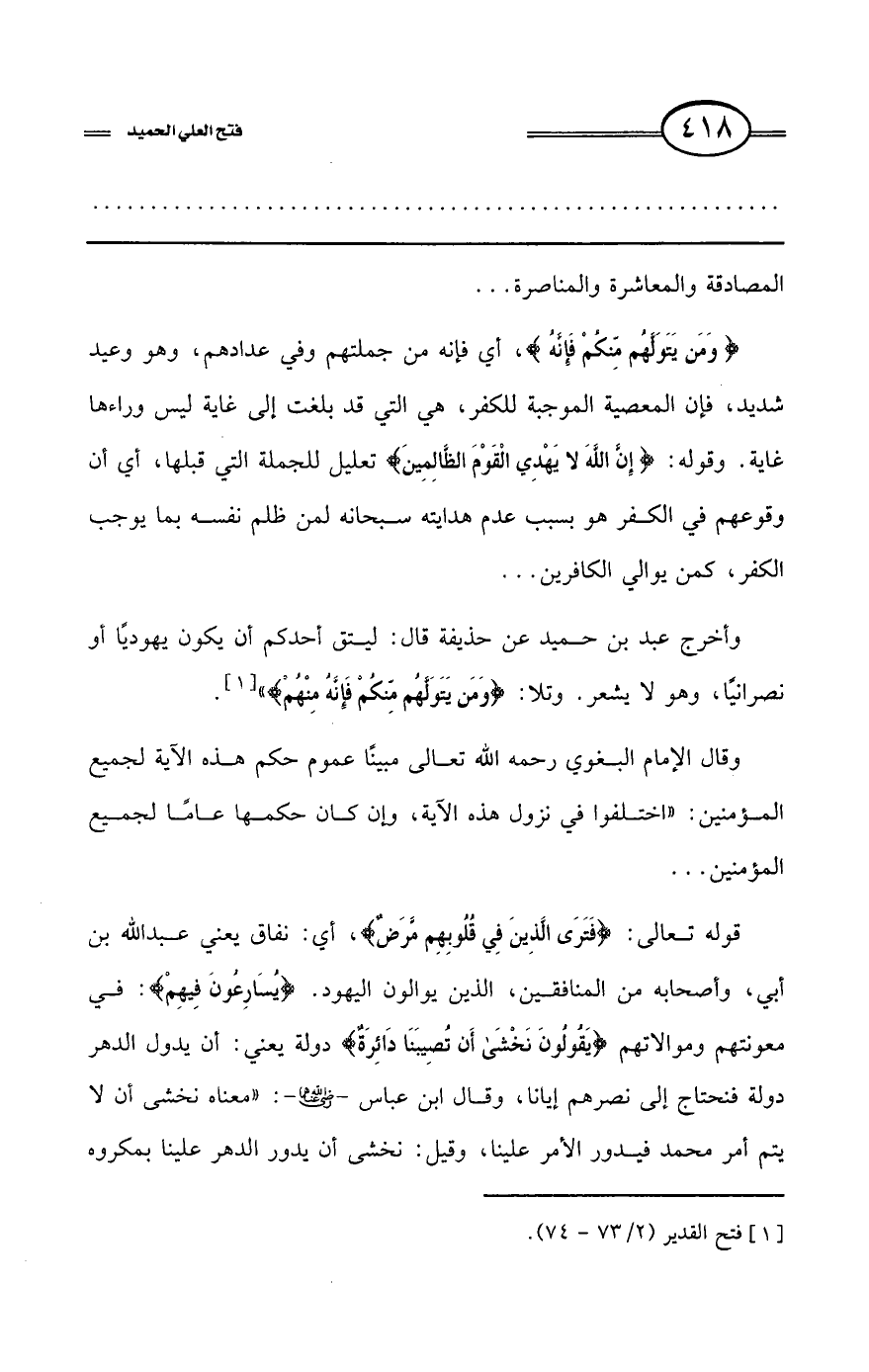 وأخرج عبد بن حميد عن حذيفة قال: ليتق أحدكم أن يكون يهوديًا أو نصرانيًا، وهو لا يشعر. وتلا: {وَمَنْ يَتَوَلَّهُمْ مِنْكُمْ فَإِنَّهُ مِنْهُمْ}» (¬1).
