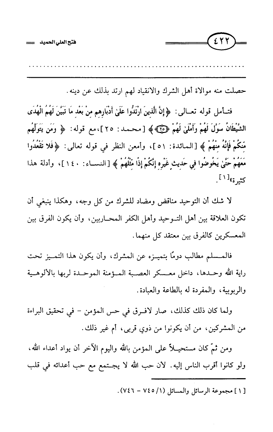 فتأمل قوله تعالى: {إِنَّ الَّذِينَ ارْتَدُّوا عَلَى أَدْبَارِهِمْ مِنْ بَعْدِ مَا تَبَيَّنَ لَهُمُ الْهُدَى الشَّيْطَانُ سَوَّلَ لَهُمْ وَأَمْلَى لَهُمْ} [محمد: 25]، مع قوله: {وَمَنْ يَتَوَلَّهُمْ مِنْكُمْ فَإِنَّهُ مِنْهُمْ} [المائدة: 51]، وأمعن النظر في قوله تعالى: {فَلاَ تَقْعُدُوا مَعَهُمْ حَتَّى يَخُوضُوا فِي حَدِيثٍ غَيْرِهِ إِنَّكُمْ إِذًا مِثْلُهُمْ} [النساء: 140]، وأدلة هذا كثيرة» (¬1).