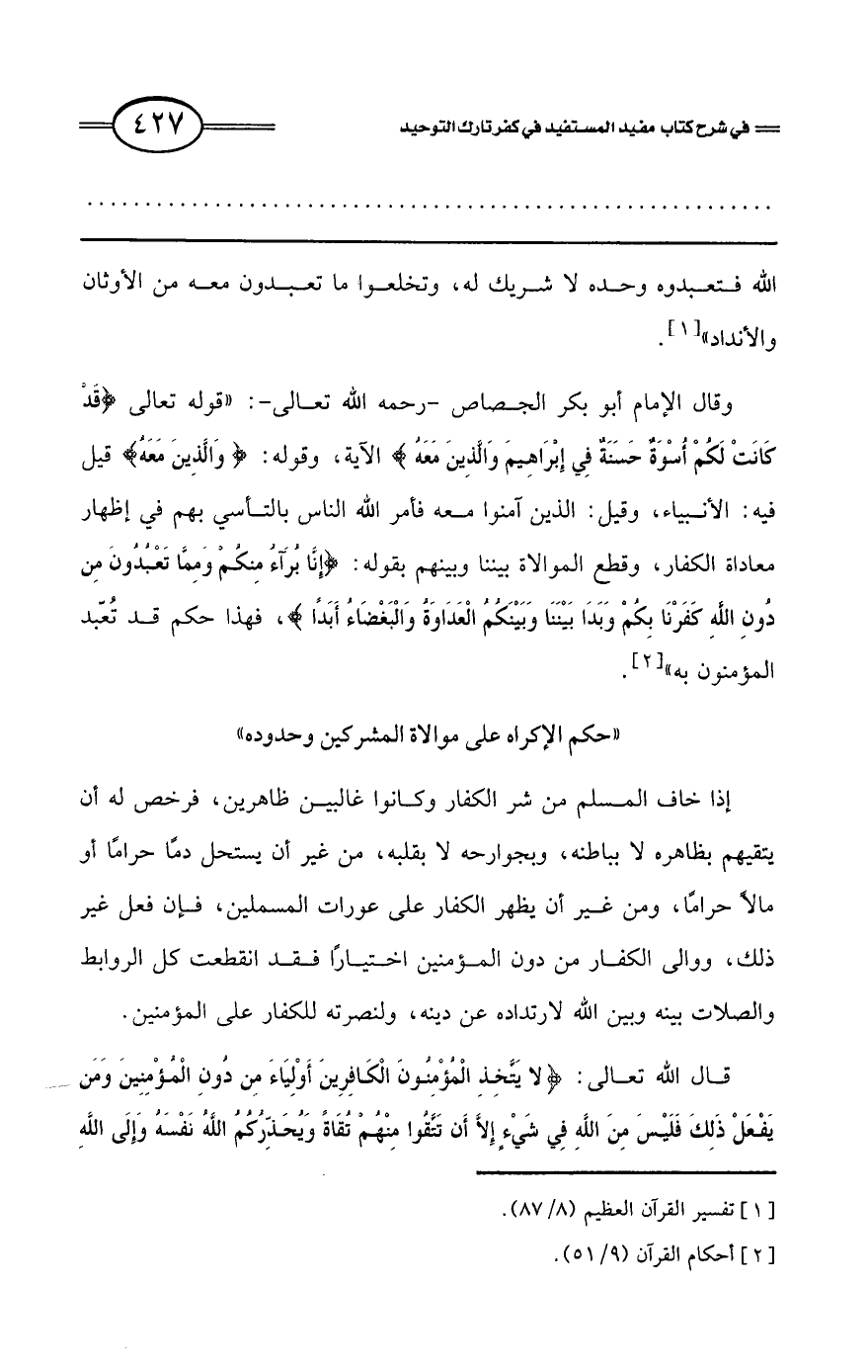 وقال الإمام أبو بكر الجصاص -رحمه الله تعالى-: «قوله تعالى: {قَدْ كَانَتْ لَكُمْ أُسْوَةٌ حَسَنَةٌ فِي إِبْرَاهِيمَ وَالَّذِينَ مَعَهُ} الآية، وقوله: {وَالَّذِينَ مَعَهُ} قيل فيه: الأنبياء، وقيل: الذين آمنوا معه فأمر الله الناس بالتأسي بهم في إظهار معاداة الكفار، وقطع الموالاة بيننا وبينهم بقوله: {إِنَّا بُرَآَءُ مِنْكُمْ وَمِمَّا تَعْبُدُونَ مِنْ دُونِ اللَّهِ كَفَرْنَا بِكُمْ وَبَدَا بَيْنَنَا وَبَيْنَكُمُ الْعَدَاوَةُ وَالْبَغْضَاءُ أَبَدًا}، فهذا حكم قد تعبد المؤمنون به» (¬2).