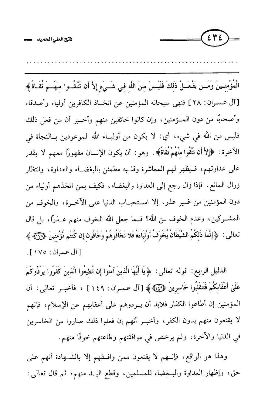 الدليل الرابع: قوله تعالى: {يَا أَيُّهَا الَّذِينَ آَمَنُوا إِنْ تُطِيعُوا الَّذِينَ كَفَرُوا يَرُدُّوكُمْ عَلَى أَعْقَابِكُمْ فَتَنْقَلِبُوا خَاسِرِينَ} [آل عمران: 149]، فأخبر تعالى: أن المؤمنين إن أطاعوا الكفار فلا بد أن يردوهم على أعقابهم عن الإسلام، فإنهم لا يقنعون منهم بدون الكفر، وأخبر أنهم إن فعلوا ذلك صاروا من الخاسرين في الدنيا والآخرة، ولم يرخص في موافقتهم وطاعتهم خوفًا منهم.