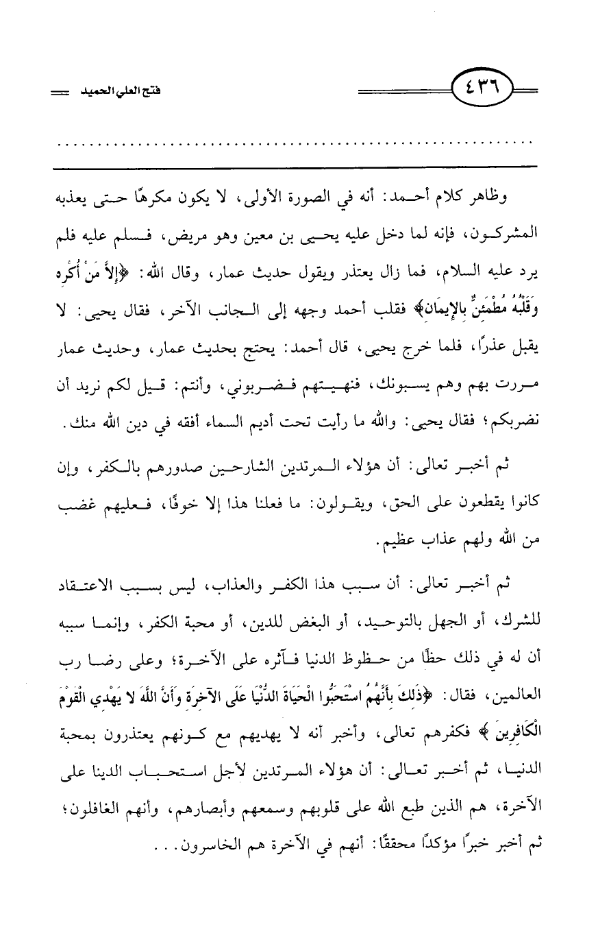 وظاهر كلام أحمد: أنه في الصورة الأولى، لا يكون مكرهًا حتى يعذبه المشركون، فإنه لما دخل عليه يحيى بن معين وهو مريض، فسلم عليه فلم يرد عليه السلام، فما زال يعتذر ويقول حديث عمار، وقال الله: {إِلاَّ مَنْ أُكْرِهَ وَقَلْبُهُ مُطْمَئِنٌّ بِالْإِيمَانِ} فقلب أحمد وجهه إلى الجانب الآخر، فقال يحيى: لا يقبل عذرًا، فلما خرج يحيى، قال أحمد: يحتج بحديث عمار، وحديث عمار مررت بهم وهم يسبونك، فنهيتهم فضربوني، وأنتم: قيل لكم نريد أن نضربكم؛ فقال يحيى: والله ما رأيت تحت أديم السماء أفقه في دين الله منك.