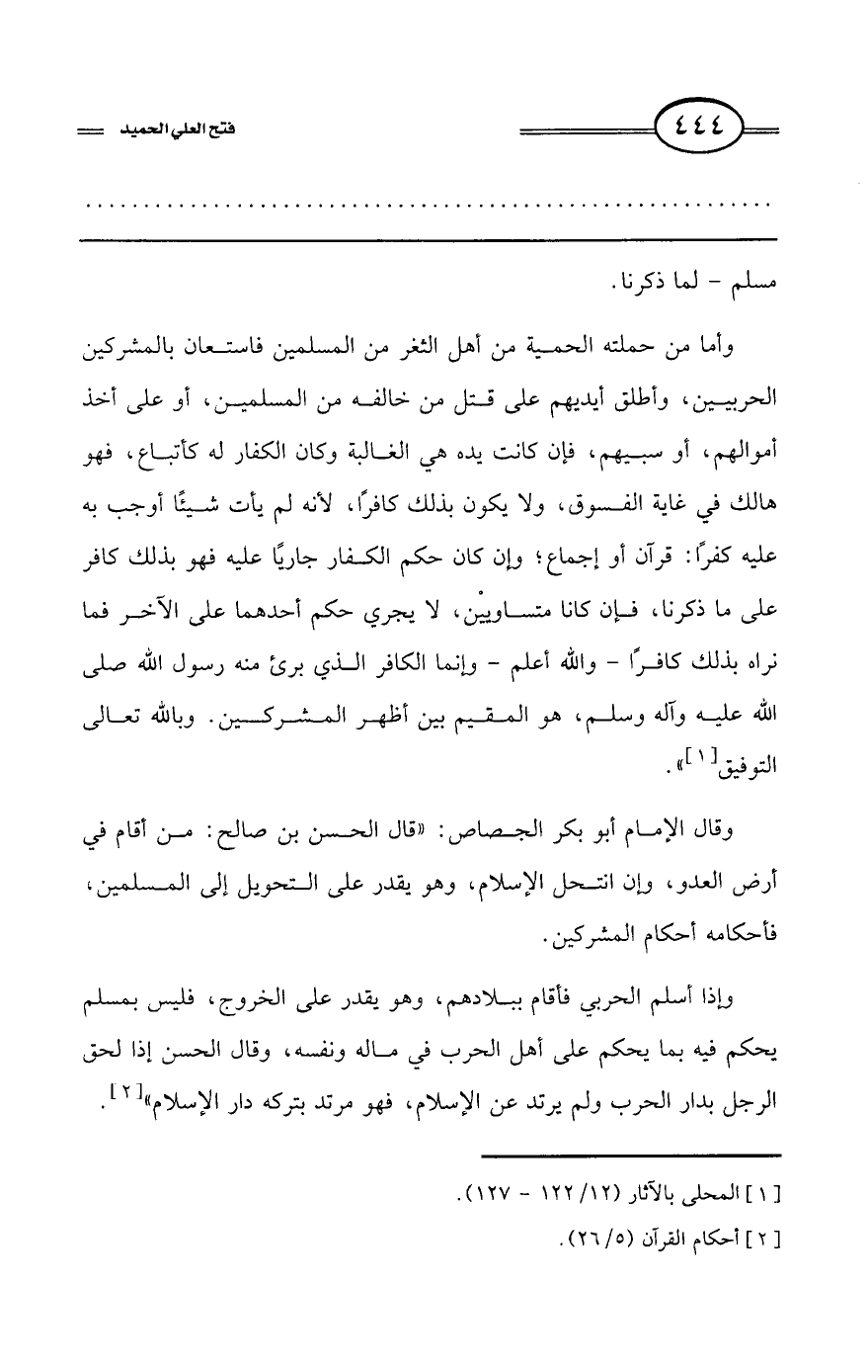 وقال الإمام أبو بكر الجصاص: «قال الحسن بن صالح: من أقام في أرض العدو، وإن انتحل الإسلام، وهو يقدر على التحويل إلى المسلمين، فأحكامه أحكام المشركين.